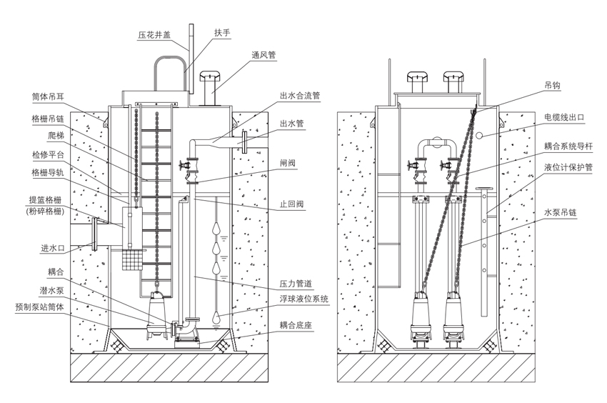 ※ 高度集成:泵站作為一體化設(shè)備,成套提供:泵站筒體、壓力管道、檢修平臺(tái)、檢修爬梯、格柵過(guò)濾裝置、耦合系統(tǒng)、泵提升系統(tǒng)、通風(fēng)裝置、防滑井蓋、照明系統(tǒng)等。